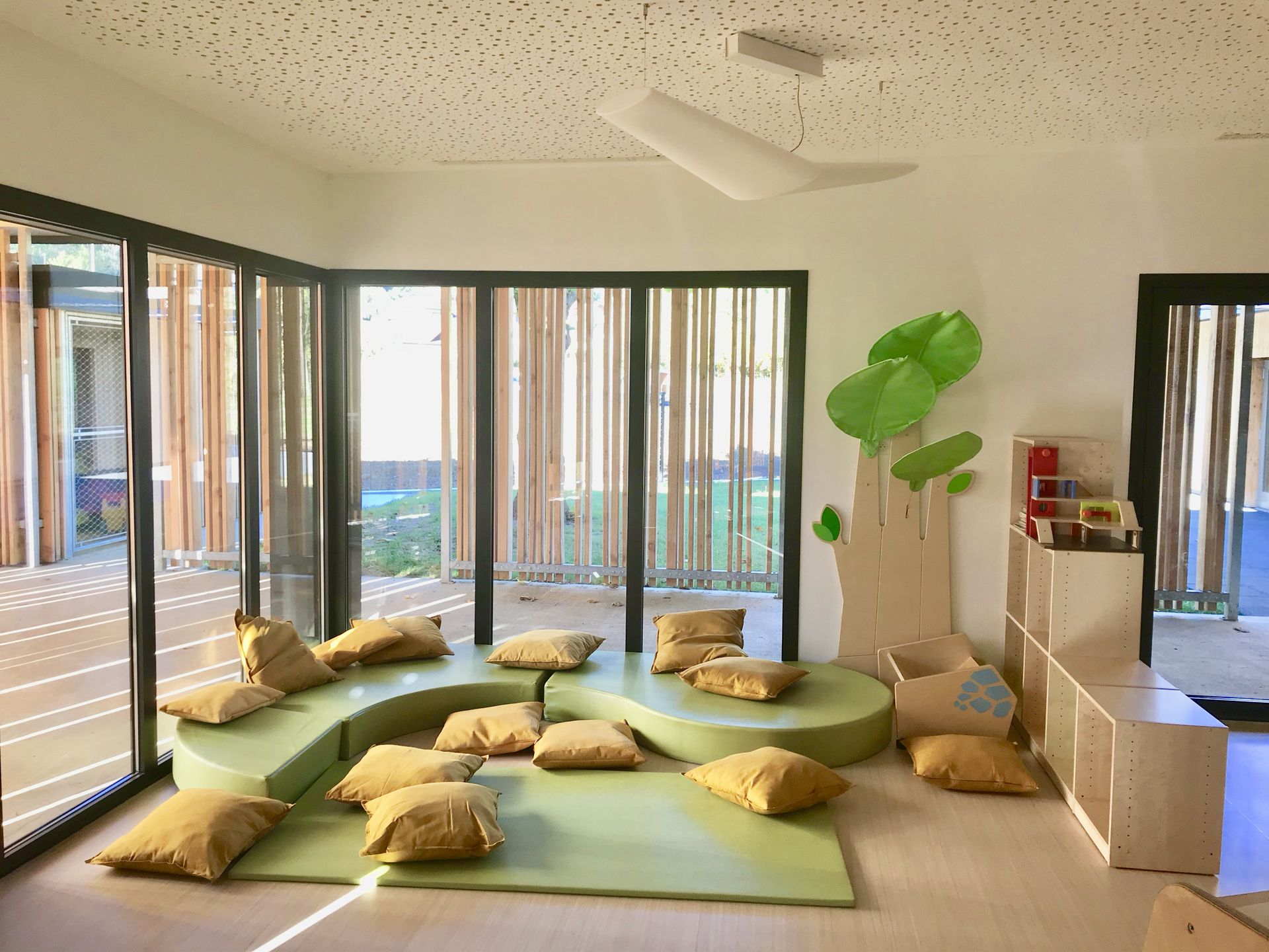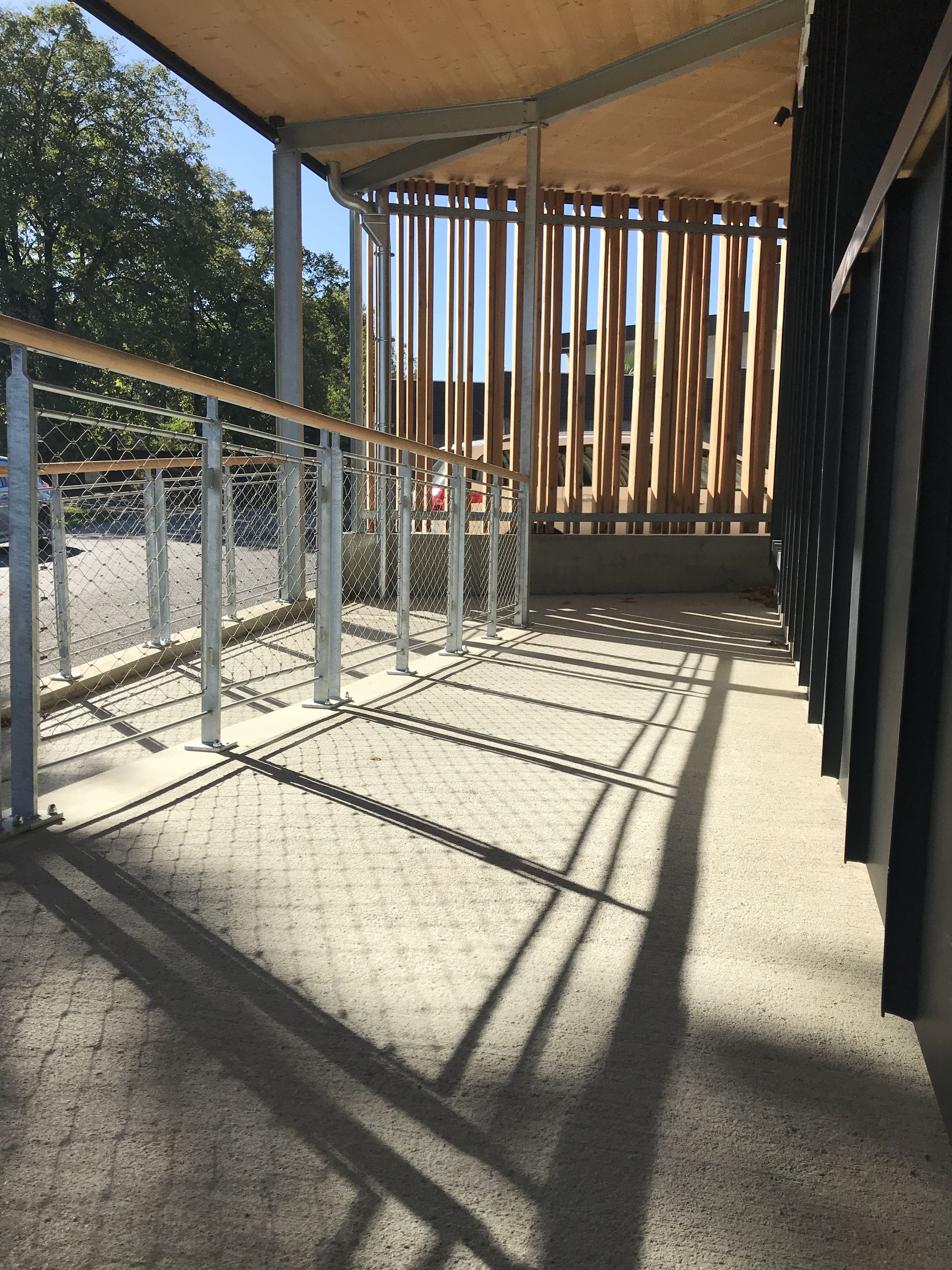 dans la zone d’accueil et de jardin. Une structure secondaire en acier galvanisé forme une couverture fine au dessus des circulations extérieures. Enfin, Le bardage bois a claire voie viens délimité partiellement les volumes extérieurs.